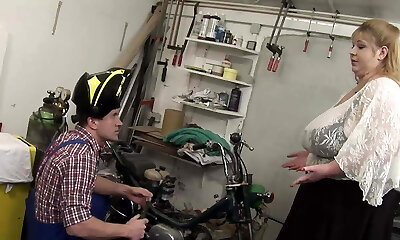 Buxom short haired mature BBW pounded doggy style by a younger dude