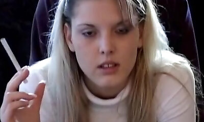 Drunk platinum-blonde sucking dick while smoking a cigarette.