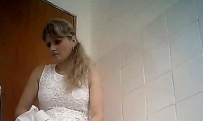 Fine curvaceous light-haired lady in white dress filmed in the rest room room