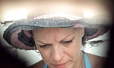 Mature white lady in blue bikini pisses in the public toilet room on the beach