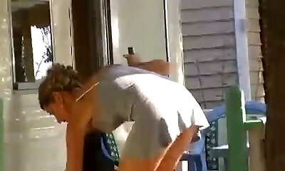 Young neighbor spies on long legged dark skinned MILF fingering herself